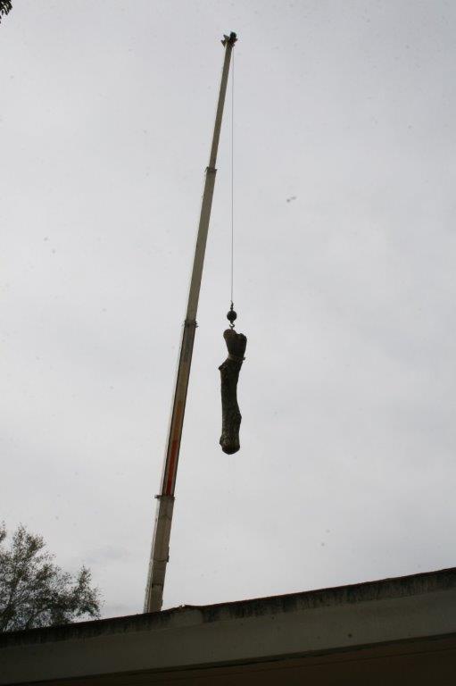 Step 1Always use the right tools for the job. In this case a large crane with a professional crane operator is essential to ensure the safety of the structure and the crew. The use of a crane also speeds up the process by allowing fast removal of large pieces of the tree at one time, and moving it away from the structure to a safe spot to be further cut up if necessary before loading onto our truck to be hauled away. |