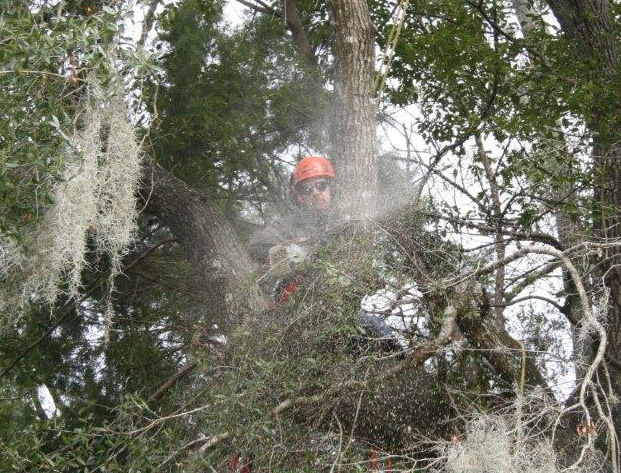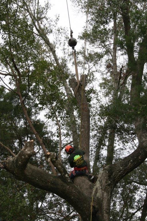 Step 2The tree cutter is lifted into the tree and placed into a secure area of the tree and tied off with all professional rigging equipment and safety harnesses. |